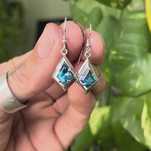 Handcrafted with precision, The Fara Earrings fuse geometry and craftsmanship. High polished solid sterling silver forms a stepped taper frame around a kite shaped 1.50ct London Blue Topaz in each earring. These are a one of one, never to be remade.