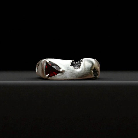 This is The Kanani Ring , a bold piece carefully hand carved from wax , then cast into Sterling silver. A deep red trilliant garnet sits in the center, gripped by pointed "Dragon Claws" . The surface is etched with intentional blackened erosion , giving the ring a broken-in feel from the start. Clean in parts, rough in others , a balance between structure and decay